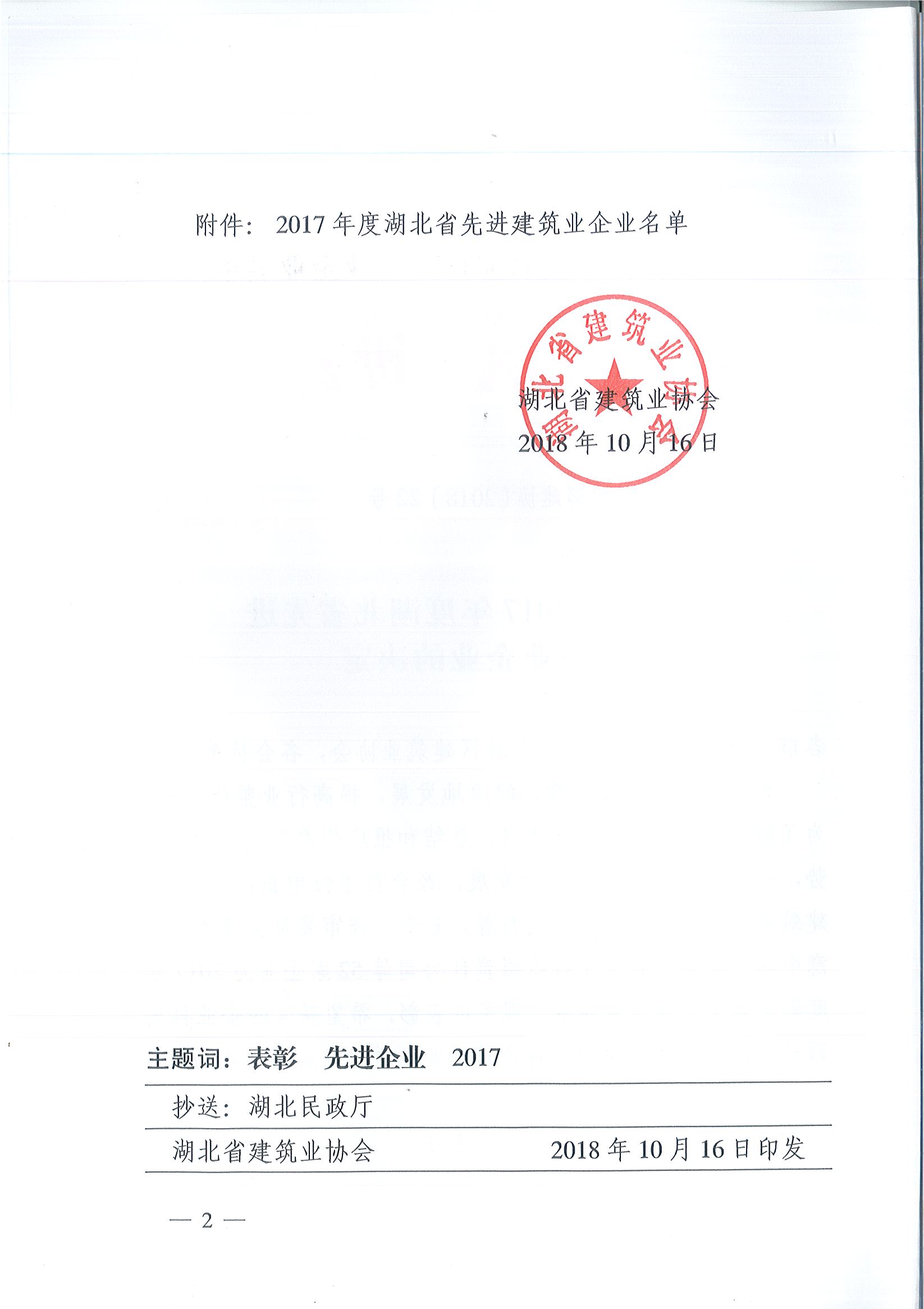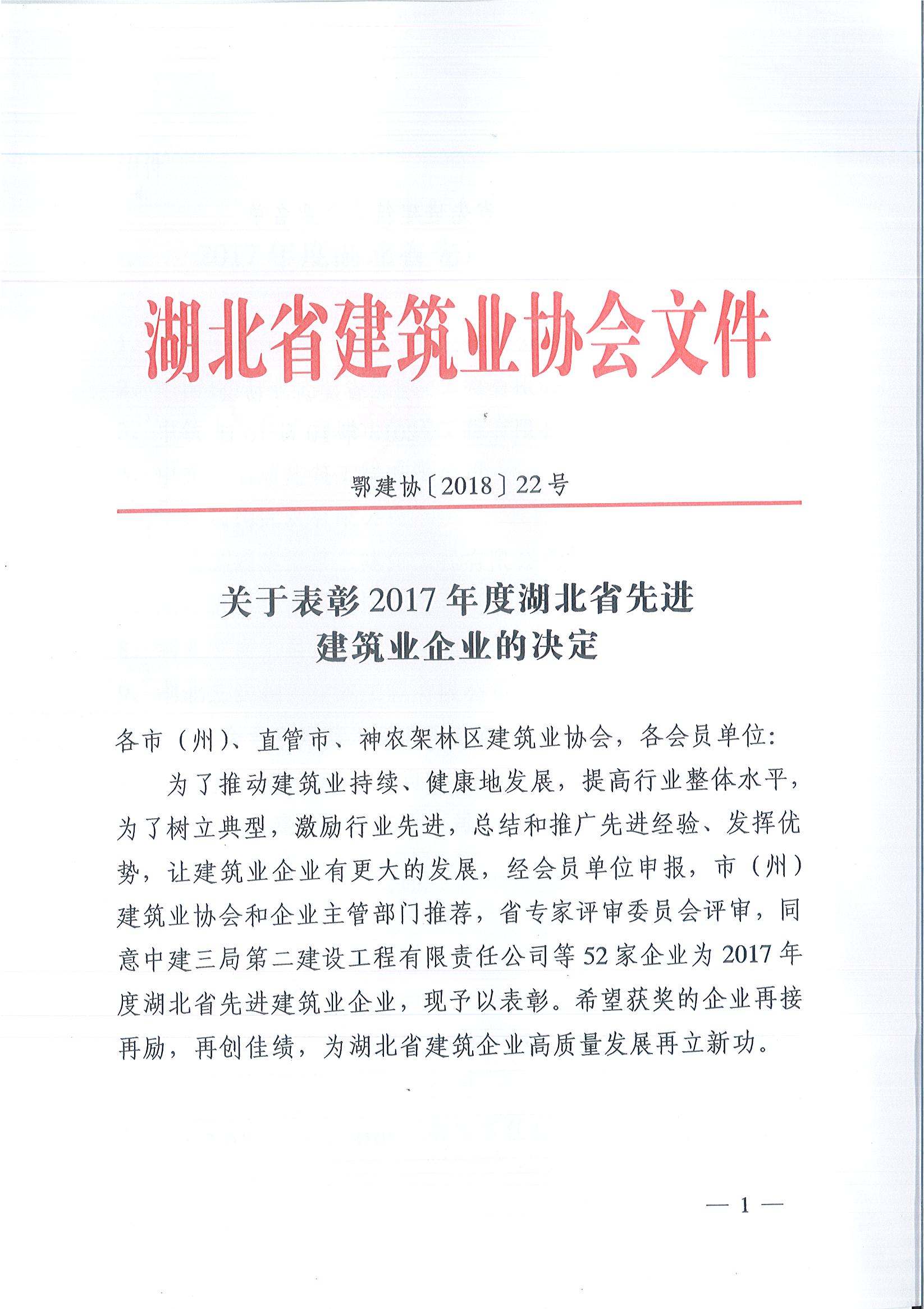 關(guān)于表彰2017年度湖北省先進(jìn)建筑業(yè)企業(yè)的決定