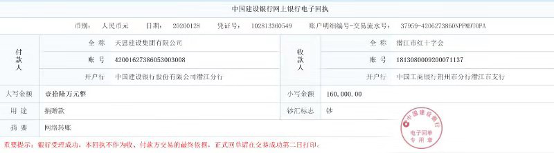 2020年初,一場突如其來的新冠肺炎疫情,讓我們措不及防。天恩集團(tuán)心系疫情,情系家鄉(xiāng),愛心捐款倡議書發(fā)出后,短短的一天時(shí)間,公司和天恩建科、天恩鋼構(gòu)、祥榮等分公司捐資130000元,員工捐款30000元,共計(jì)160000元,經(jīng)總經(jīng)辦匯總后統(tǒng)一轉(zhuǎn)至潛江紅十字會。