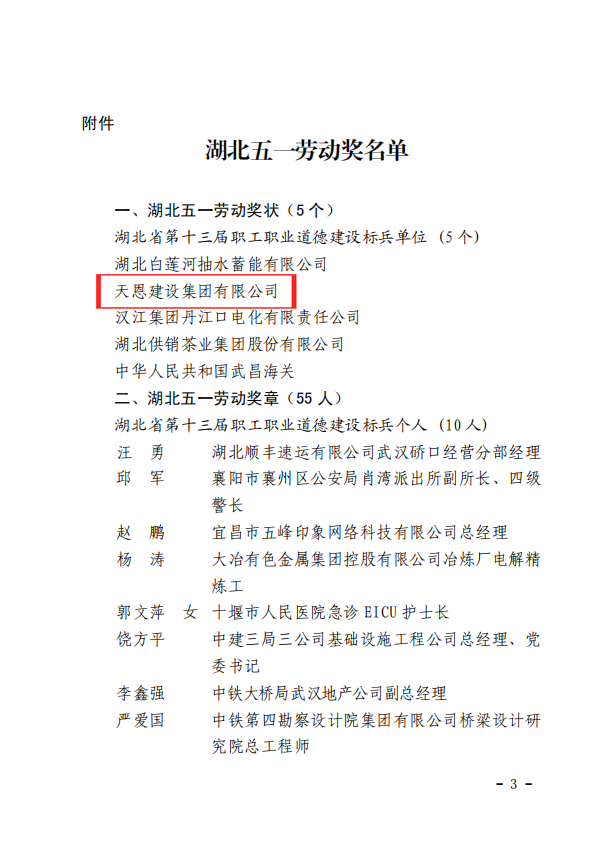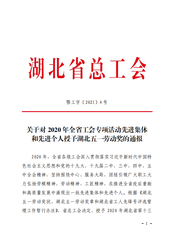 近日,從湖北省總工會(huì)《關(guān)于對(duì)?2020?年全省工會(huì)專項(xiàng)活動(dòng)先進(jìn)集體和先進(jìn)個(gè)人授予湖北五一勞動(dòng)獎(jiǎng)的通報(bào)》中獲悉,在2020年湖北省總工會(huì)組織開(kāi)展的“職工職業(yè)道德建設(shè)”專項(xiàng)活動(dòng)中,天恩建設(shè)集團(tuán)有限公司取得優(yōu)異成績(jī),榮獲“湖北五一勞動(dòng)獎(jiǎng)狀”。