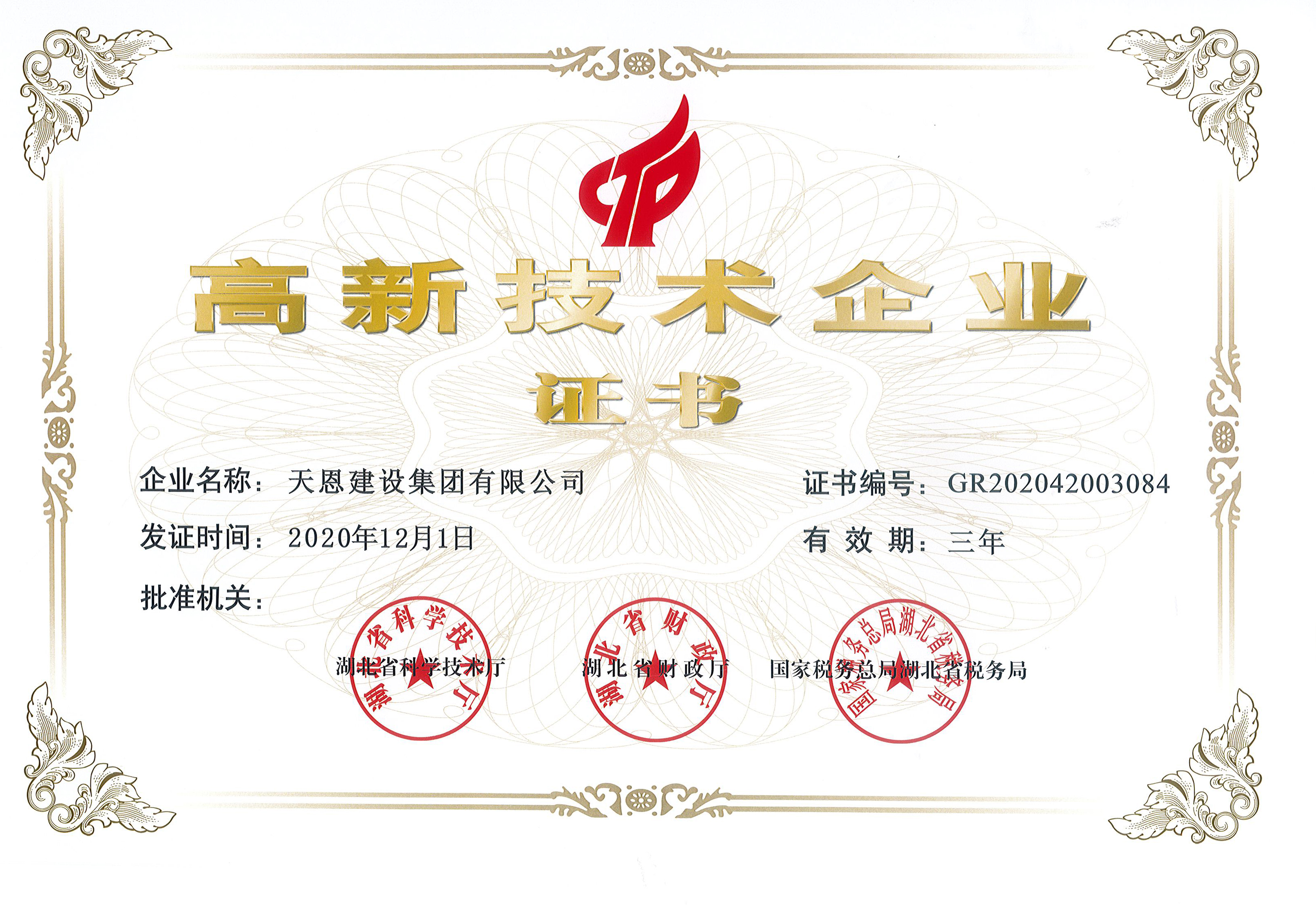 天恩建設集團有限公司憑借專業(yè)的研發(fā)隊伍、雄厚的技術實力、持續(xù)的創(chuàng)新能力、科學的企業(yè)管理,順利通過高新技術企業(yè)認定,榮獲由湖北省科學技術廳、湖北省財政廳、國家稅務總局湖北省稅務局聯合聯合頒發(fā)的“高新技術企業(yè)證書”。