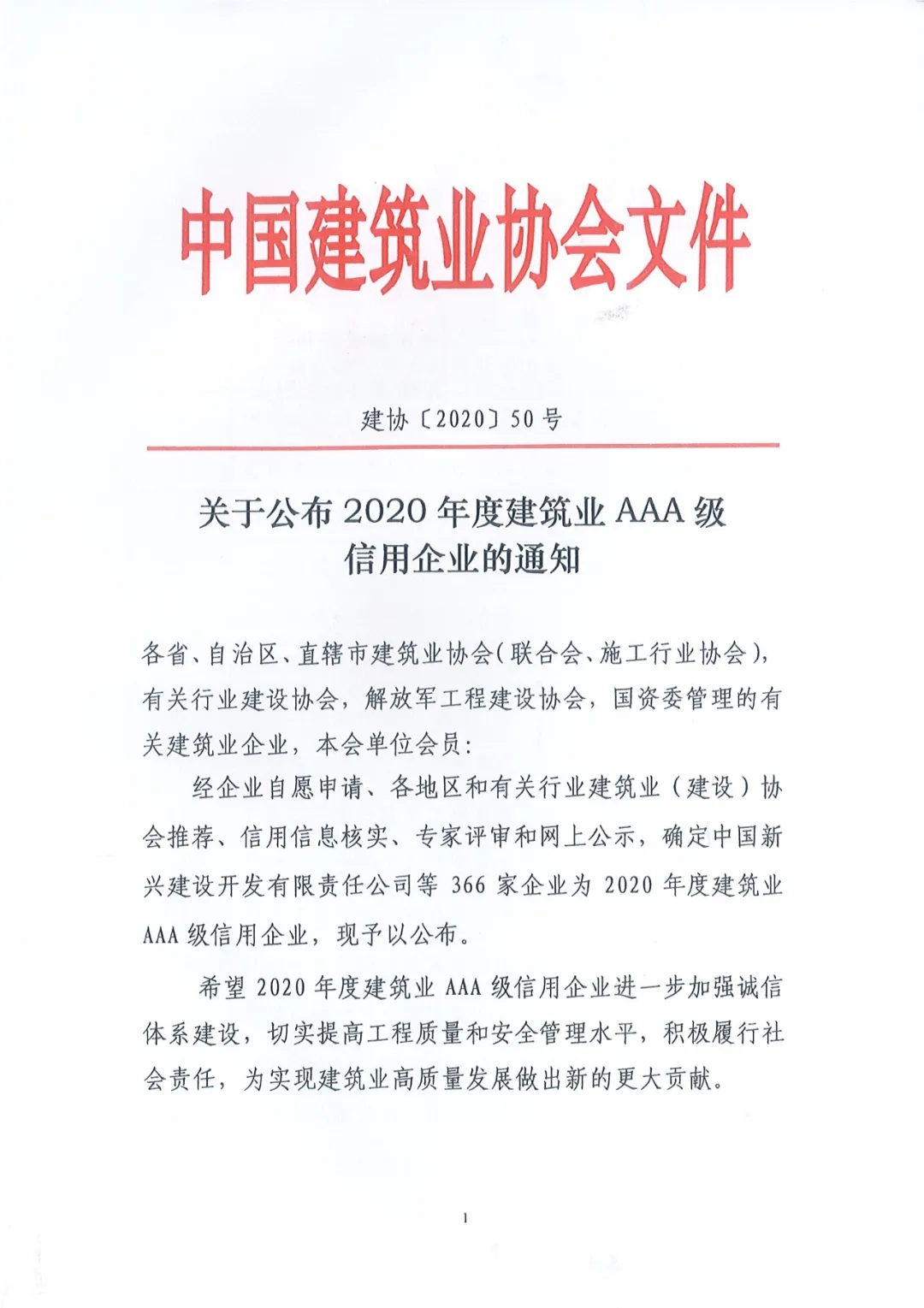 榮譽丨天恩集團榮獲2020年度中國建筑業(yè)協會AAA級信用企業(yè)
