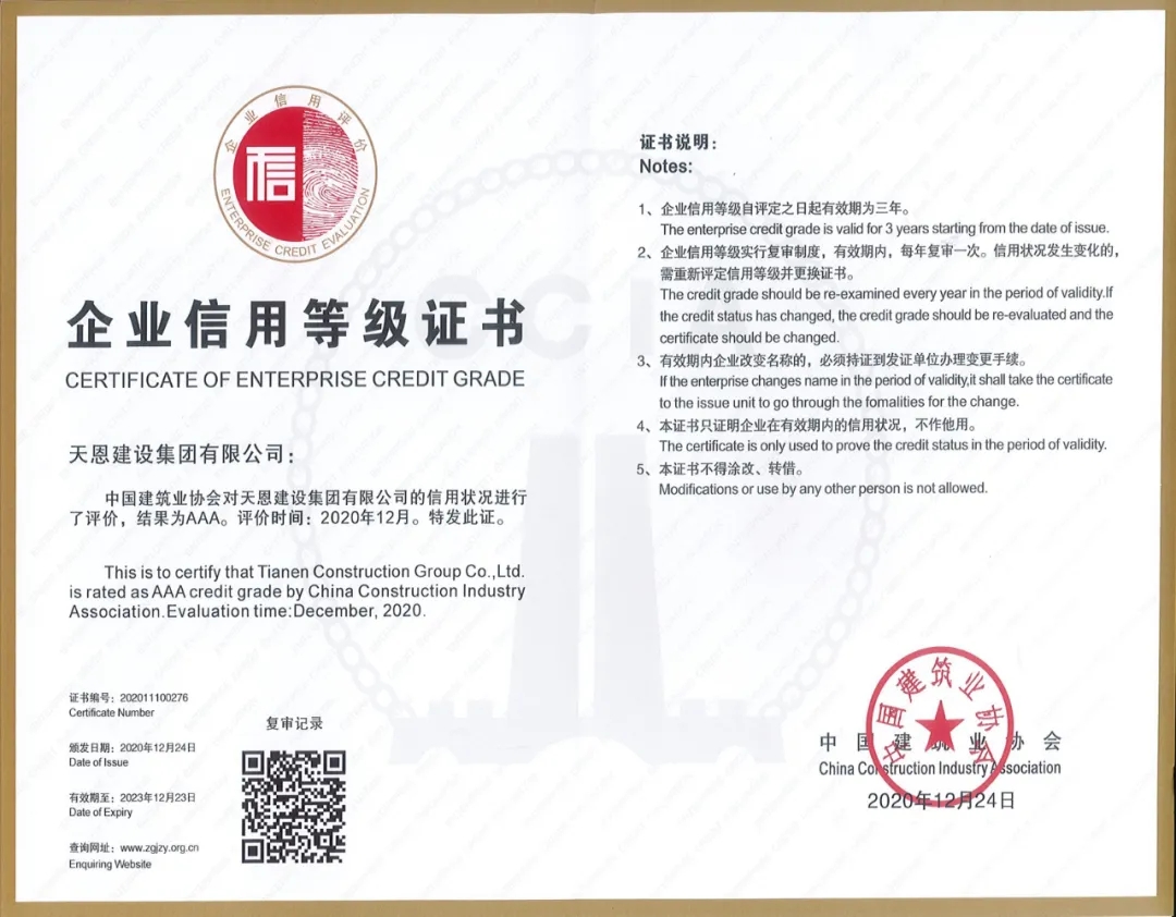 天恩建設集團有限公司秉承“誠信、務實、創(chuàng)新、領先”的經營理念,加強誠信體系建設,提高工程質量和安全管理水平,積極履行社會責任,為實現建筑業(yè)高質量發(fā)展做出了突出貢獻。2020年12月24日,中國建筑業(yè)協會授予我公司“2020年度建筑業(yè)AAA級信用企業(yè)”榮譽稱號。